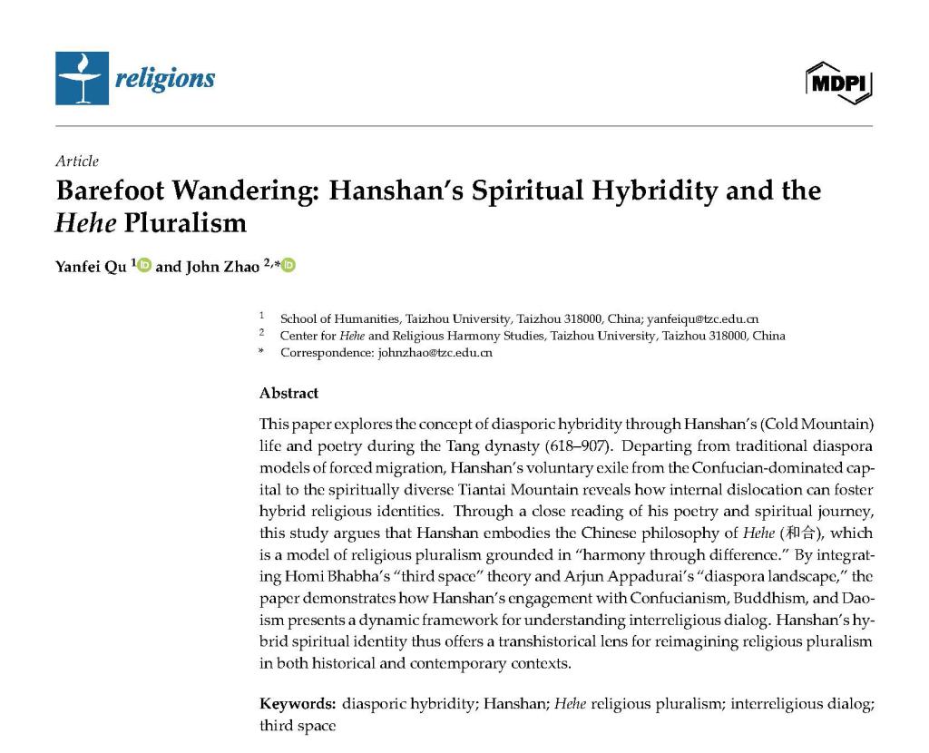 本院讯公司屈燕飞副教授与马克思主义公司赵轩博士合作完成的论文《芒鞋踏歌:寒山灵性之融与和合之境》(Barefoot Wandering:Hanshan's Spiritual Hybridity and the Hehe Pluralism)近日正式发表。该研究突破了传统宗教多元论的西方理论框架,首次系统性地阐发了“和合多元主义”(Hehe Pluralism)这一植根于中国思想传统的理论范式,为全球宗教哲学研究贡献了中国智慧。