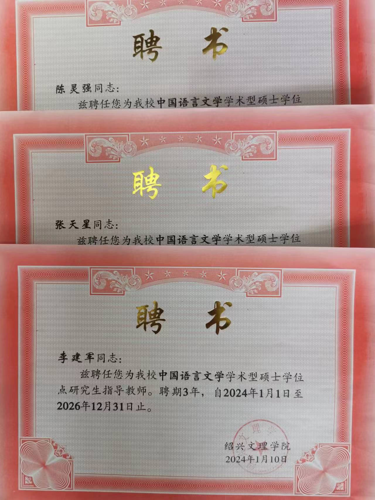 近日,公司李建军教授、陈灵强教授、张天星教授获聘绍兴文理公司中国语言文学学术型硕士学位点研究生指导教师,聘期三年。