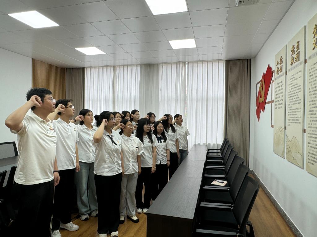 重温一次入党誓词,永葆入党初心。在杨盛老师的带领下,毕业生党员们佩戴党员徽章,面向党旗,以饱满的激情、昂扬的斗志,郑重宣誓:“我志愿加入中国共产党,拥护党的纲领,遵守党的章程,履行党员义务,执行党的决定…”一字一句,字字铿锵。毕业生党员回望大学时期写入党申请书的情形,再次感受到当时的热忱与初心,激励自己在今后不负使命,以实际行动为党旗和母校增添光彩。“时间的脚步永不停歇,奋斗的脚步永不止步”相信每一位心怀梦想的台院学子,都终将在新时代绽放芬芳。
