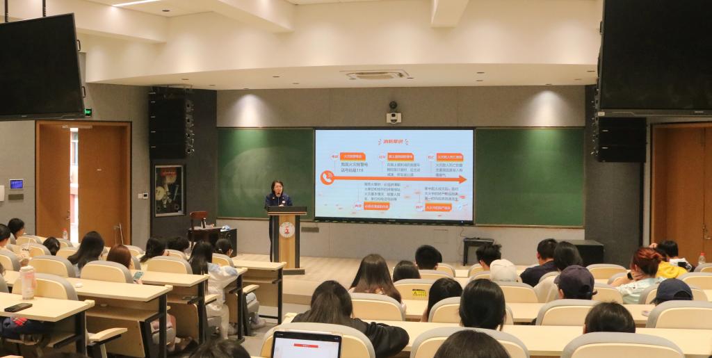 金丹丹聚焦火灾预防,结合校园实际情况,指出插线板老化、杂物堆积等问题极易引发火灾,呼吁师生及时清理可燃物、严格控制火源。同时,她着重介绍了消火栓、灭火器等消防设施的重要性,提醒大家要熟悉其位置,以便在紧急情况下能够迅速取用。针对逃生技巧,金丹丹强调了警觉“初期火灾”的重要性。她提醒师生,在浓烟环境下要根据烟层高度灵活调整姿势,无烟时快速撤离,烟浓时低姿前行,避免盲目弯腰。此外,她还特别提醒公共区域勿装封闭防盗窗,要预留逃生口,确保生命通道畅通。为了让师生更直观地认识到消防安全的重要性,金丹丹通过火灾案例警示大家要提高安全意识,增强应急能力。另外,她强调了随手关防火门、不堵塞通道等细节的重要性,并详细说明火灾报警时需提供的准确信息。