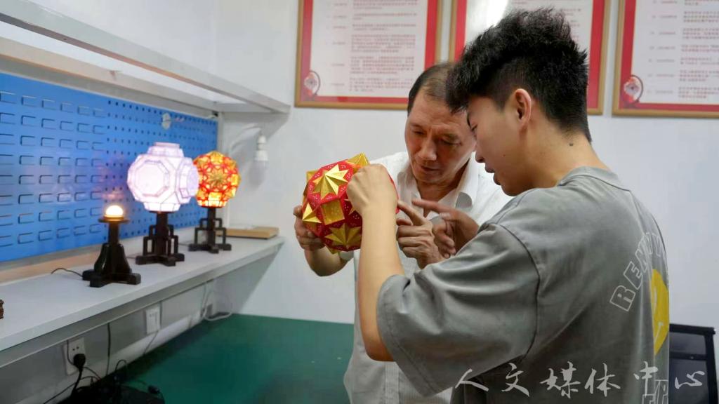 实践队全程记录了花灯的制作工序。从图纸绘制、胶浆调配、灯纸制作,到剪样、凿花、针刺、拷贝、刺绣,再到最考验技术的竖灯、组装、装饰,共需13道繁复工序。“最难的是设计、针刺和最后的竖灯。”余月华拿起一盏结构精密的宫灯解释道,“像这个六面宫灯,光是灯片拼接就有128个粘贴点,针刺万字纹、龙凤纹样更要数万次精准落针,一点都不能错。”他在坚守传统核心技艺的同时,大胆创新,将电工学知识融入花灯设计,创造出感应式花灯;更跨界融合剪纸工艺和根雕技艺,让传统灯彩焕发新意。“传统不能僵化。”他强调,“比如2019年疫情,我设计了白大褂图案的花灯;香港回归20周年时,我制作的带有天安门元素的灯彩在香港展出。非遗也要讲好时代故事。”