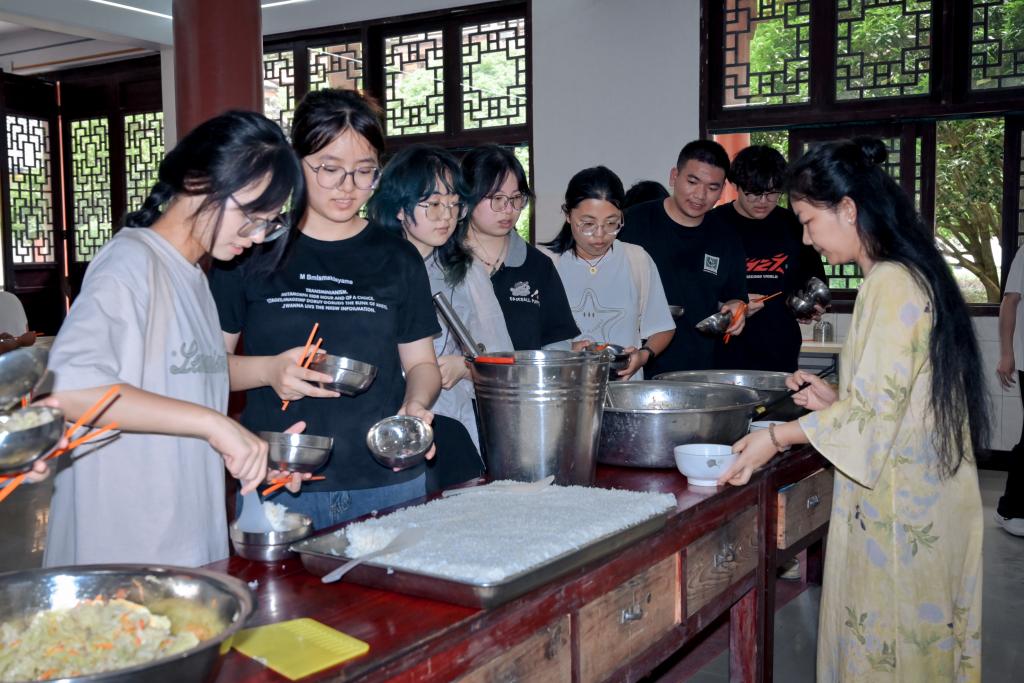 时近正午,周蓉盛情邀请实践队体验寺庙素斋,让队员们在朴素的饮食中感受寺院生活,于禅意氛围中共话文化保护与传承的心得。临别前,双方在古寺前留下珍贵合影,为上午充实的考察画上圆满句号。