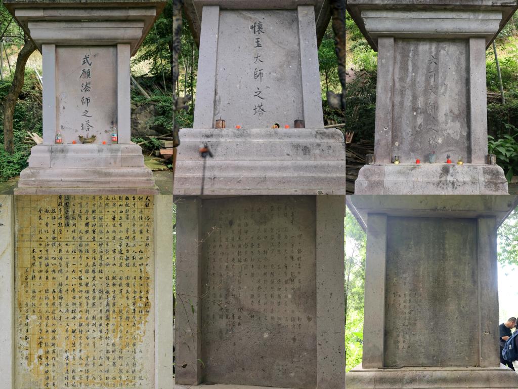 探索并未止步于地面建筑。经寺内僧人的指引,队员们穿过一条掩映于草木之中的小径,抵达一处静谧之地——这里矗立着由式愿法师、怀玉大师以及六可大师三人的塔组成的塔林。队员们仔细考察、认读了式愿法师塔身后镌刻的铭文,从而领略了一段有关于佛教文化存续与重生的珍贵往事。铭文有载:式愿晚年正值文革冲击后的中国佛教文化的复苏期,在个人佛学著作付之一炬、寺庙凋零的窘境下,他自发重建涌泉寺并引资创办佛公司,主动承担起了抢救与延续佛教文化命脉的重要责任。接着,队员们对另外两座塔也进行了细致入微的考察,深刻感受到了塔铭所承载的厚重历史。这些历经风霜的文字,无声地诉说着三位住持的生平事迹及其在佛教发展历程中的印记。