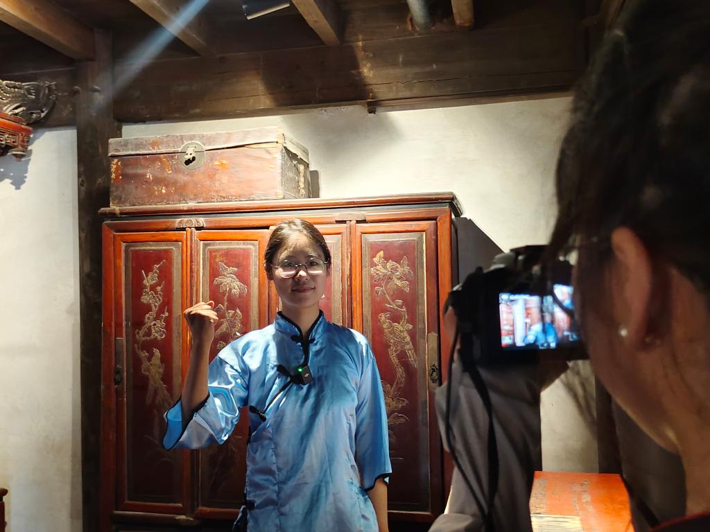 郭凤韶扮演者与讲解员交谈