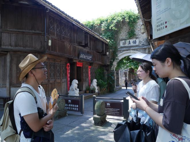 实践队随后考察了临海紫阳街,沿着紫阳真人张伯端的历史足迹,探究道教自然和合的思想理念。在紫阳街北门,队员们观摩了刻有《悟真篇》节选的雕墙,该典籍倡导的“教虽分三,道乃归一”思想,展现了道教道法自然、和合包容的文化特征。通过实地走访,队员们深入了解了紫阳故里“清净无为”的哲学内涵。
