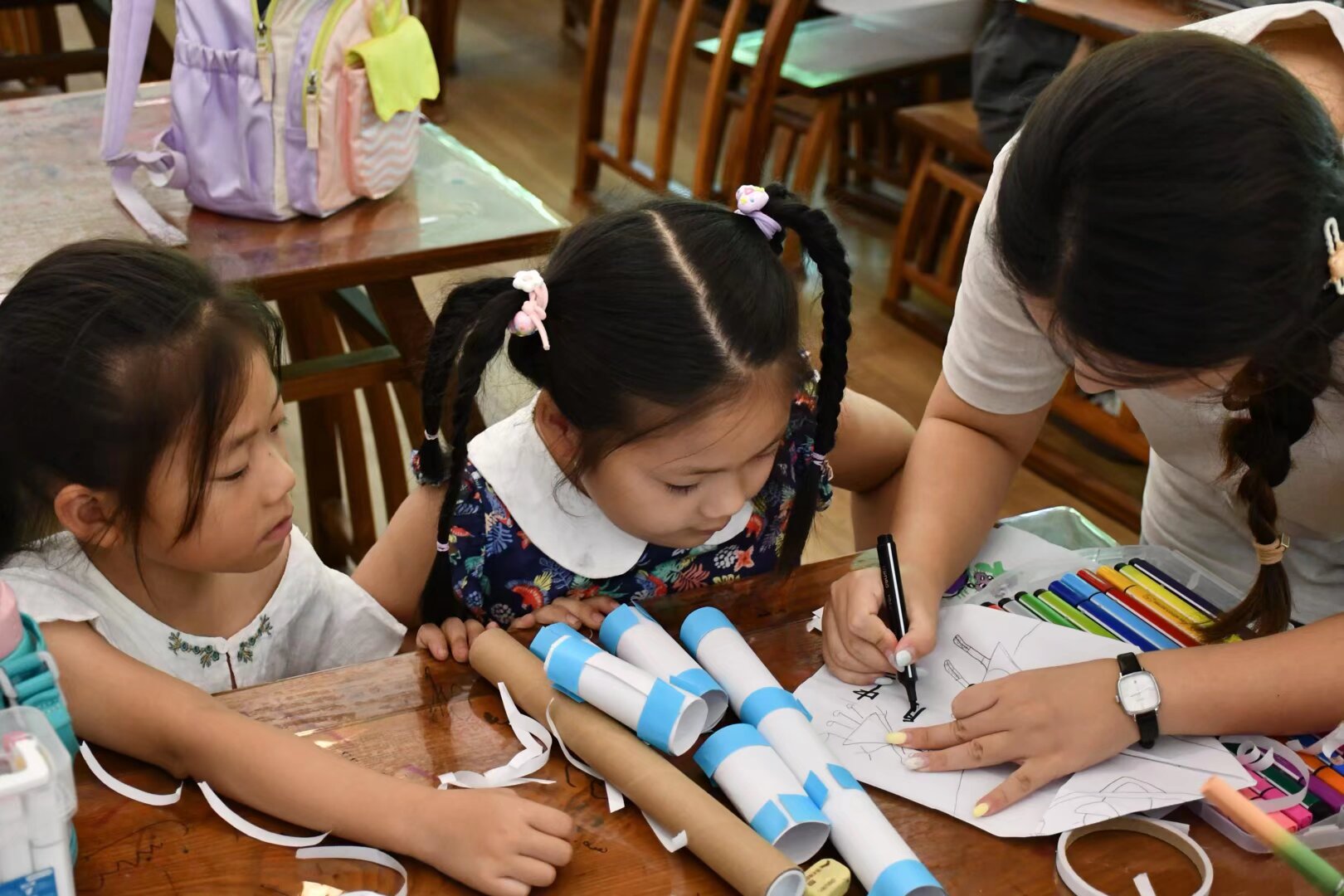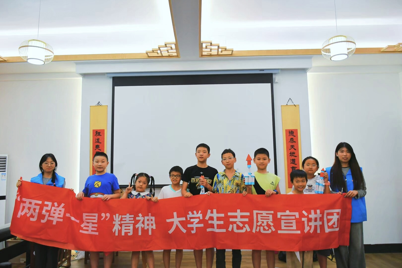 实践队员指导小朋友制作火箭模型