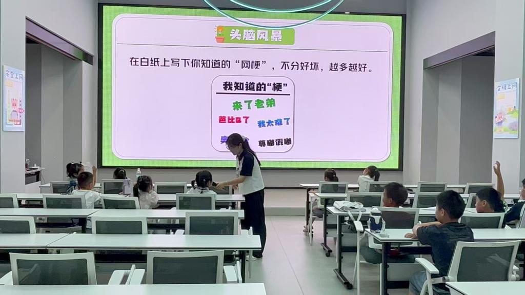 辨别网络烂梗,让语言回归纯粹。午后,警惕网络烂梗的小课堂同样发人深省。实践队员用情景剧还原“谐音恶搞”“低俗调侃”等常见网络用语不文明现象,教孩子们用“你来啦”代替“来了老弟”,用“真糟糕”代替“芭比 Q”,帮助孩子们跳出低俗化表达。