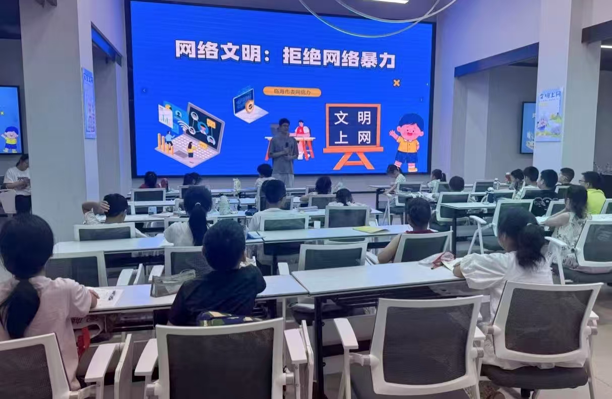 7月11日,实践队结合网络文明实践中心的特性,把网络暴力、文明上网和网络烂梗等内容进行有机串联,为孩子们开展了独具特色的网络安全“一日课程”。