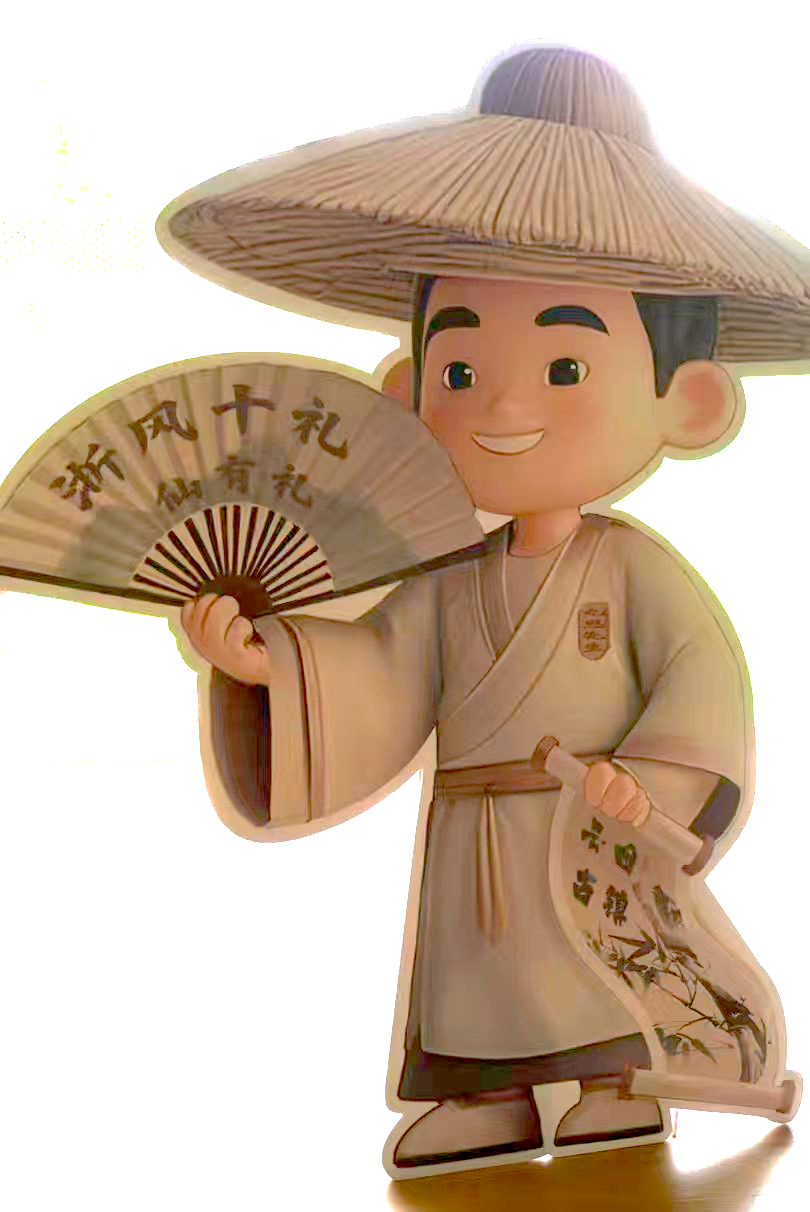 “比如我们以柯九思为核心打造文化IP,不仅要挖掘他的历史成就,更要让他‘活’在当下。”她举例时,抬手指了指墙角——长衫飘飘的柯九思IP立牌静静伫立,手里轻捏一把“浙风十礼”水墨扇,竹影在墙上映出细碎的晃动,活脱脱是从古籍里走出来的模样。话落,她转身从立牌旁的架子上取下一个帆布袋,上面印着同款IP形象:“下一步将推出帆布袋、冰箱贴等系列文创产品,让历史人物成为连接传统与现代的纽带。”