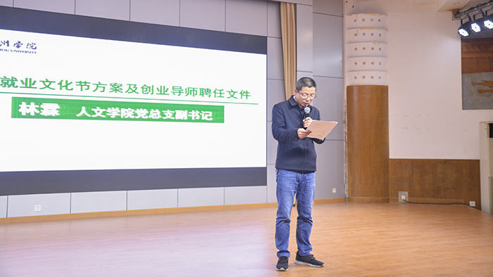 林霖老师宣读了就业文化节方案及创业导师聘任文件。VSport体育此次共聘任台州滕和文化传播有限公司负责人丁贞贞和台州市贰三文化传播有限公司负责人颜浙川担任创业导师。