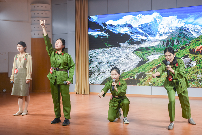 本次比赛分主题朗诵、车轮战及演诵三个环节。“星河战队”朗诵的组诗《诗颂朦胧》温柔熨帖,向观众展现了朦胧诗的柔美与浪漫;“光宗耀祖队”诵咏的组诗《五四青年说》由平缓至激昂地表达了对祖国的热爱;“咆哮队”则用高昂的情绪感染了观众,以一首《雷电颂》将现场气氛推向高潮。在车轮战中,十二位选手以各自独特的方式将《乡愁》《我爱这土地》《饮酒》《沁园春·长沙》四首诗演绎出来。演诵环节中细腻精巧的情景剧编排、或柔婉或激昂的声音将观众带入不同的情境。