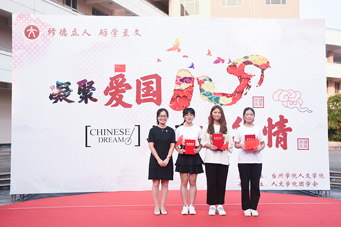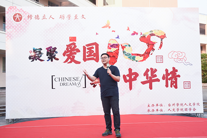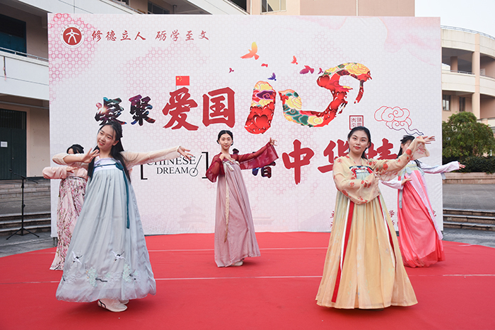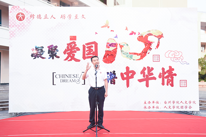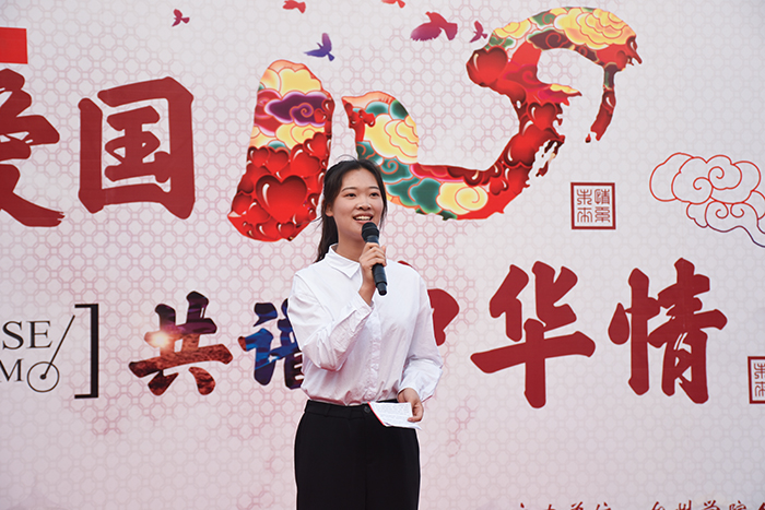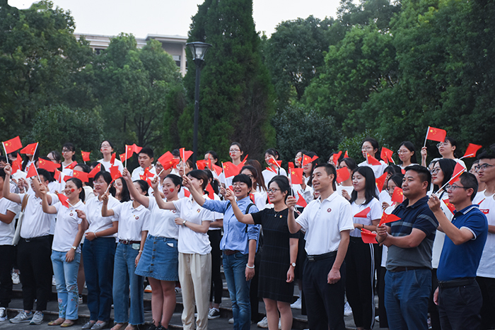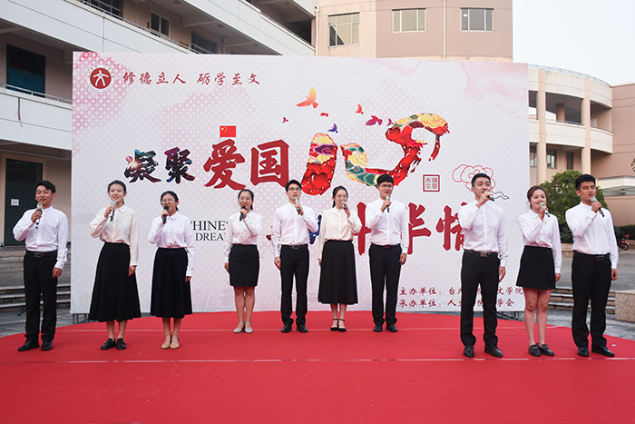 社团优秀节目展演环节中,文渊汉学社一舞《繁花》穿越古今,向大家展示浓浓中国古韵;“风雅”诵读社朗诵从古至今的多部爱国名家名篇,用声音诠释家国情怀。活动接近尾声,岑玥、李素芳、沈俏南、王启臻四位领唱同学用歌声吹响号角,在场师生挥舞手中的小红旗,集体合唱,感受着融入血脉中的中华情,《我和我的祖国》旋律回荡在员工活动中心上空。主题教育活动开始前,人文学子还齐聚八根大柱开展“快闪”活动,四支小分队挥动着小红旗缓步前行,汇合成方阵,齐唱《我和我的祖国》庆祝新中国成立70周年。