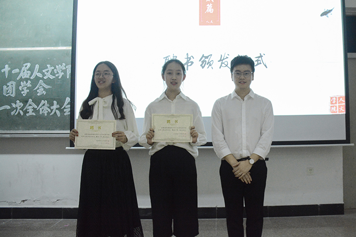 本次大会分为老师致辞、聘书颁发仪式、主席团发言、部门介绍和部门规章制度培训五个环节。会上,林霖副书记首先欢迎19级新生加入人文团学会,给团学会注入新的力量。强调指出,新时代的青年员工要担当时代责任,牢固树立责任意识、使命意识和担当意识,勇做走在时代前列的奋进者、开拓者、奉献者。作为党的助手和后备军,团学干部要坚定对马克思主义的信仰,坚持党的领导,听党话、跟党走,积极践行党的初心和使命,要自觉把个人理想抱负融入民族复兴伟大理想和中国特色社会主义伟大实践,充分展现新时代青年的担当作为。林霖副书记希望同学们从严要求自己,坚持以学习为中心,努力掌握科学知识,提高内在素质,锤炼过硬本领,提升担当能力。强化实践锻炼,努力在团学工作的实际中去学习、思考和探索,勇于面对困难和问题,在团结同学、服务员工的具体实践中健康成长、历练成才。学会与人沟通,掌握沟通技巧方法,提高工作效率。牢固树立大局观念、全局意识,坚持个人利益服从集体利益,团结协作,无私奉献,提升团学会的凝聚力、战斗力。积极践行校训院校精神,坚持以德为先,提升道德修养。接着,夏文杰老师为主席团成员和各部门部长颁发聘书。