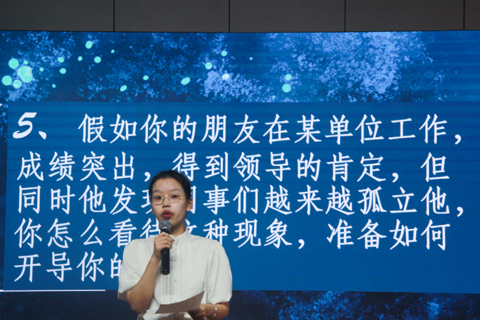 比赛分为“秀出自我”“秘书技能”“即兴演讲”三个环节。在简短的自我介绍后,七位选手以激情饱满的朗诵、文艺的吉他弹唱、动人的钢琴演奏等节目展示才艺,给在场观众留下了深刻印象。“秘书技能”环节中,通过现场模拟职场中可能遇到的多种情景,选手们妥善处理了各种突发问题,展现出对秘书工作的理解及专业知识储备情况。“即兴演讲”环节中,各位选手结合自身的生活经历与知识储备,并应用秘书专业技能巧妙地化解难题,分条设列、形象生动的演讲赢得台下热烈的掌声。