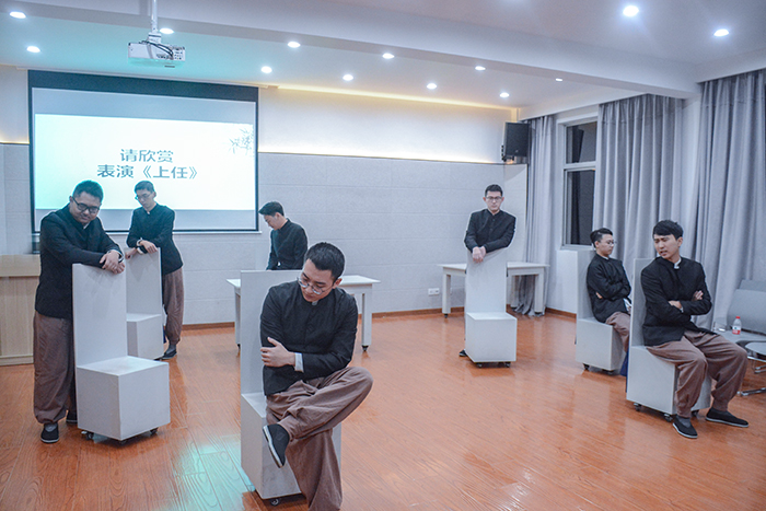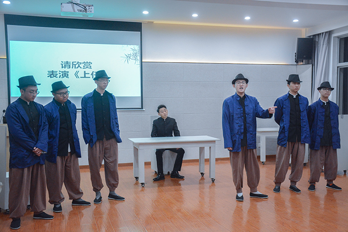 《老舍五则》以现代戏剧的表现手法,串成了一部多角度反映老北京市井人生的悲喜剧。活动伊始,通过观看《老舍五则》演出的现场视频,演员们就《柳家大院》简要分析了人物形象。张二嫂的饰演者笑谈话剧的表演颠覆了自我形象,也指出了舞台表现层次感不足的问题。以“穷人挤兑起穷人来,比富人压榨穷人还可怕”这一经典评论引出了老北京社会的平庸之恶,幽默讽刺艺术与社会现实批判的结合在老舍作品中得到了纯熟的发挥。人物形象间既有相似之处,又有不同之处。相似的是张二哥、老王作为老北京小市民的市侩和无赖,其角色将底层穷苦人民的无奈与辛酸淋漓尽致地展现出来。不同的是老王在给洋人干活的过程中沾染了他们的习性,自身固有的封建意识和独有的优越感又荼毒了身边的人。最后,GC剧社的成员们以实地表演的形式展现了《上任》,现场掌声雷动。其中,张孟吉融合现代表演的元素,刻画出一个对内重拳出击、对外唯唯诺诺、阿谀奉承的稽查长形象。从理解每一个演绎角色的内心活动、了解每一部作品的深刻内涵开始,演员们生动地传达出了人物形象。