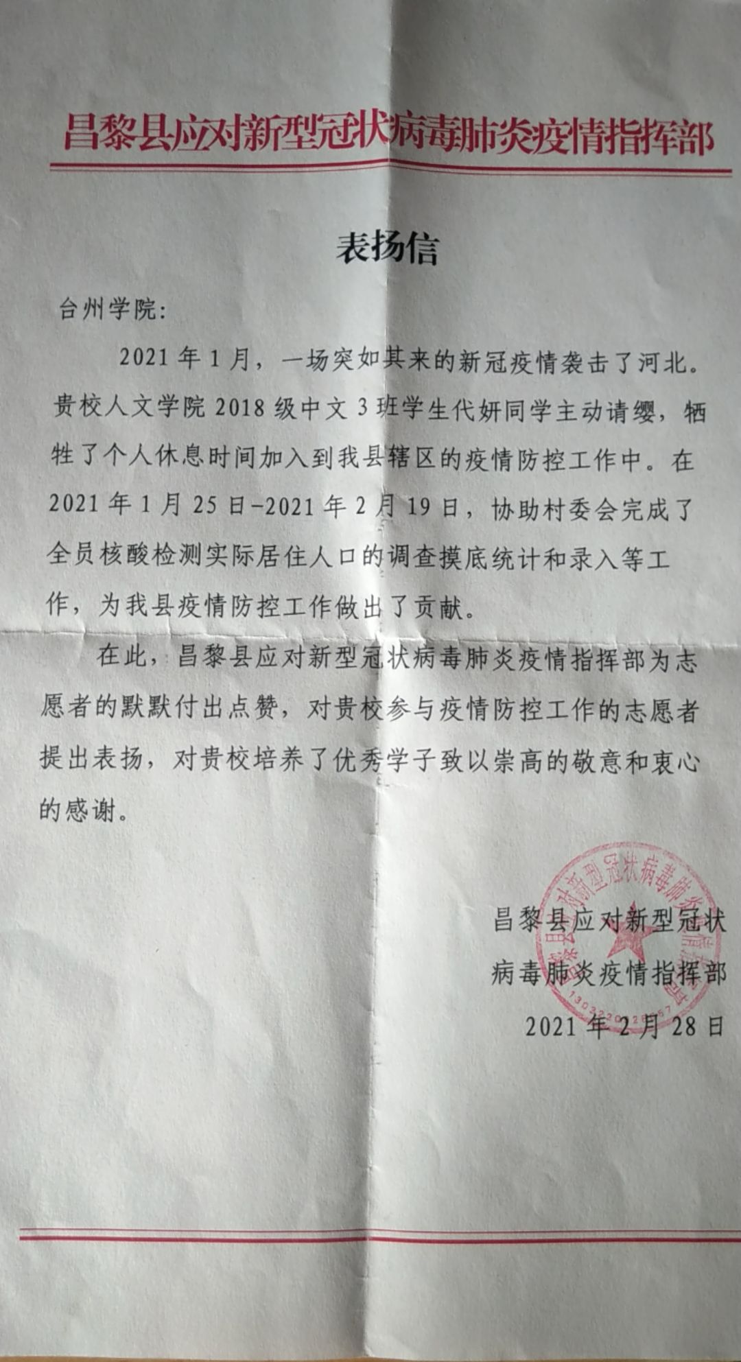 近日,VSport体育收到一封来自河北省秦皇岛市昌黎县应对新型冠状病毒肺炎疫情指挥部的表扬信,信中对公司18中文3班的代妍同学表示由衷感谢,感谢她在寒假期间,牺牲了个人休息时间加入到疫情防控工作中,为抗疫工作做出了积极贡献。