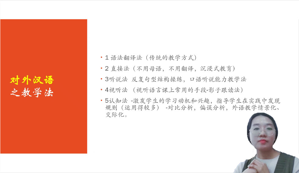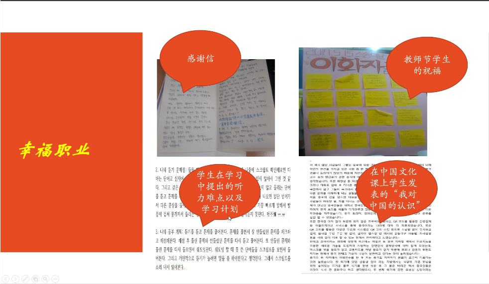讲座伊始,李花子老师谈起了自己踏上对外汉语之路的经历。随后,李老师指出在韩对外汉语的教学对象和教学目的,并且列出了五种合适的教学方法——语法翻译法、直接法、听说法、视听法、认知法。谈及在韩对外汉语的教育现状,李老师讲述汉语机构在韩国的发展历史,并阐述了韩国对外汉语中文课程逐渐增多的现象,这正充分体现了中文人才培养的多样性。紧接着,李老师通过几个对外汉语写作课的课程教学案例分享了自己的教学方法。李老师首先阐释了“回译法”的含义,并举例说明“将翻译好的文章进行再次翻译”是锻炼提升写作的一种极好方法。同时,李老师通过分析员工写作环节指出了讨论式学习的重要性,她表示“分组讨论、共同完成、对比分析”的方法可以让写作效果大大提升。最后,李花子老师分享了自己在教学过程中的心得体会,她鼓励同学们在熟练运用汉语的基础上也要掌握一门外语,并且不断提升自己的教学能力,在方式方法上不断创新。