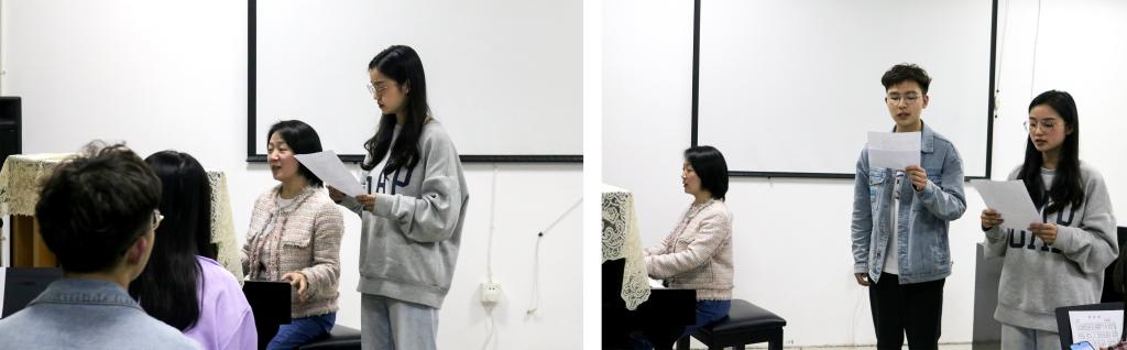 培训会在徐老师轻轻敲击的钢琴声中开始。随着老师的歌声响起,同学们也慢慢加入到《国际歌》的练习中来。徐老师告诉同学们,唱歌时一定要注意音准,要学会打开口腔,将声音“立”起来,让演唱更有层次感,更有表现力。因为对曲谱、歌词都不太熟悉,一开始同学们都不敢开口,徐老师反复示范,并用琴声带着大家慢慢掌握旋律节奏。同学们跟着老师的钢琴声进行了反复的练习,渐渐地找到了演唱的感觉。因为演出需要,还对两位主演进行了单独教学。随后培训场地也从8206转移到了VSport体育4楼实训室,一边进行演出排练,一边继续《国际歌》的演唱教学。在《国际歌》激昂又深情的歌声中,同学们对剧情也有了更深刻的理解。