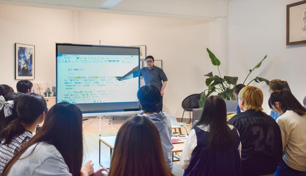 活动伊始,苏畅老师分享了自己对于《庄子》的印象:庄子最擅长的就是用诙谐幽默的语言讲述深刻的内涵,《庄子》一书其实极像笑话故事的汇编。随后,同学们轮流诵读《庄子·天下篇》并分享自己的感受,苏老师耐心地为同学们逐字逐句做出解释。