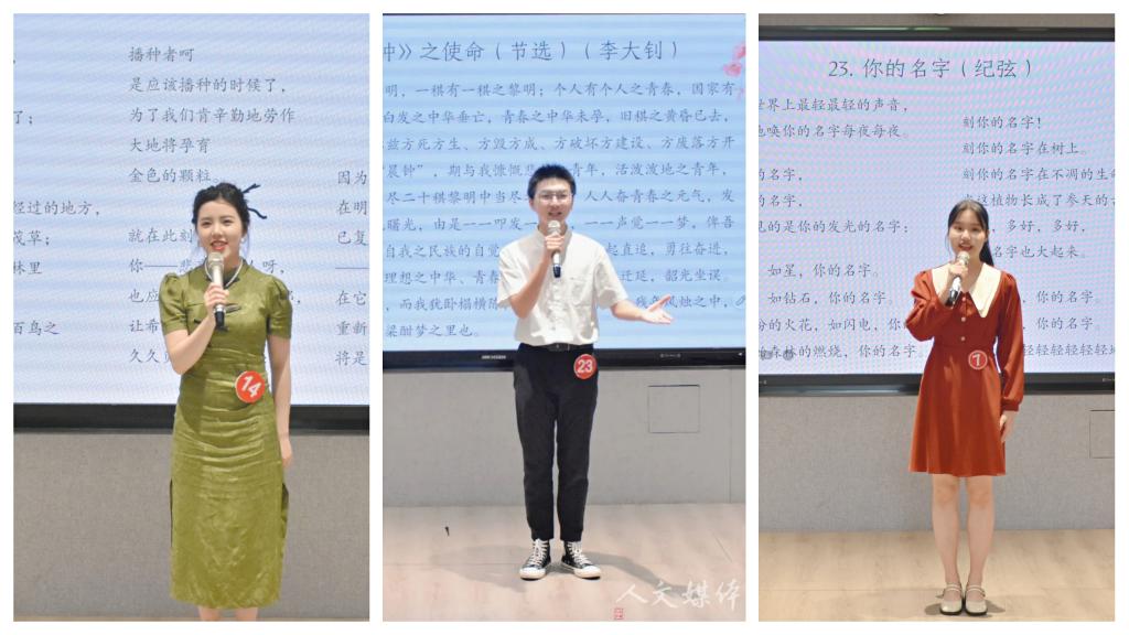 在接下来的教师点评环节,张洁老师从声音、情感与形象三方面给予参赛同学肯定与建议。金妮娅老师鼓励大家选择适合自己的文本,并注重文本的解读,协调好感情、声音与气息三者的关系。