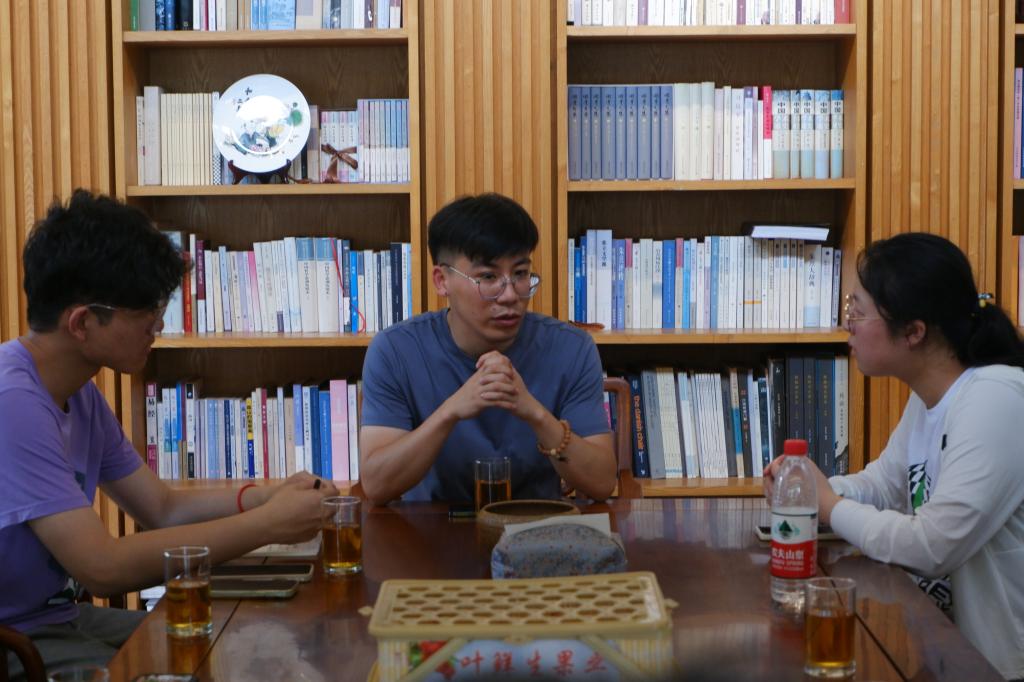 6月30日,实践队正式出发,前往天台调研寒山多彩田园研学基地、寒山隐居处寒岩、和合人间文化园等地,探索台州和合文化的教育性和体验性。午后,实践队与和合人间文化园办公室王为权主任进行深度交流。王主任详细讲述了园区内有关和合文化博物馆、“一根藤”非遗文化展馆等场所的历史沿革与修缮经过,并耐心解答了成员们提出的研学群体特征、研学特色方式等问题,最后他对诗路研学与和合文化的深度交融提出了新的思考与展望。