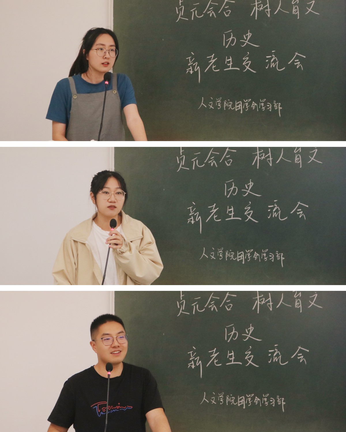 在历史专业会场上,陈飞雪以“在人文,在历史,遇见更好的自己”为题,分别从学习、课题、工作、比赛这四个方面向大家分享了相关经验。她表示在加强体育锻炼的同时,要学会借助辅助工具提高个人学习能力,同时也要学会合理规划自己的学习生涯。她还鼓励大家积极参与各大比赛,积累制作课题的经验,明确自己的定位。柴于晨以“有目标,有方向”为题,向大家分享了关于考研考编的经验,鼓励新生们树立正确的目标和方向。她向大家讲述了完成目标的“三步法”,并建议大家合理利用时间、确保有事可做、拒绝无效忙碌。杨世江以“在平凡中成长”为题,他就四个“平凡”总结了他的老员工活。杨世江建议大家要认识自己的平凡但决不能平庸,积极尝试、敢于突破才能打破平凡。