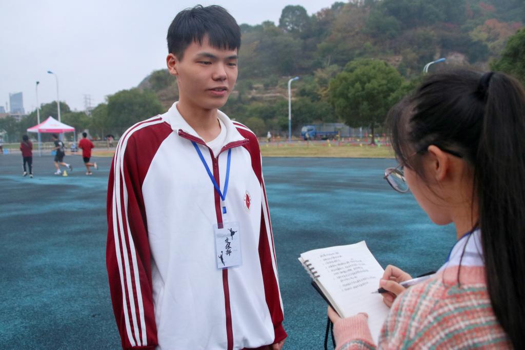 当被问及为何参加运动会志愿者活动时,他回答道:“虽是初次尝试,但我认为志愿者不仅能够在服务交流的过程中帮助他人,同时也可以很好地锻炼自己。”在本次志愿服务活动中,沈谢杰负责的主要工作是运动员早餐的联系与运送、比赛时间的通知,以及运动员检录的及时提醒。面对这些琐碎而又细微的工作,沈谢杰十分认真负责,在他的志愿服务下,运动员们得以全身心地投入到比赛之中。