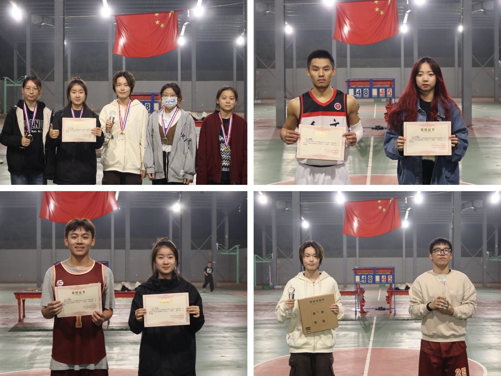 赛后进行了激动人心的颁奖仪式,大二男篮与大三女篮斩获一等奖,大三男篮与大二女篮获得二等奖,大一男篮、大四男篮、大一女篮获得三等奖,篮球场内响起欢呼声。无论结果如何,每位球员都收获了最真挚的友谊,每位观众都看到了篮球所代表的团结友爱精神。夜晚虽冷,但篮球之信念凝聚了每一位同学的心,热情在心中如火把燃烧。