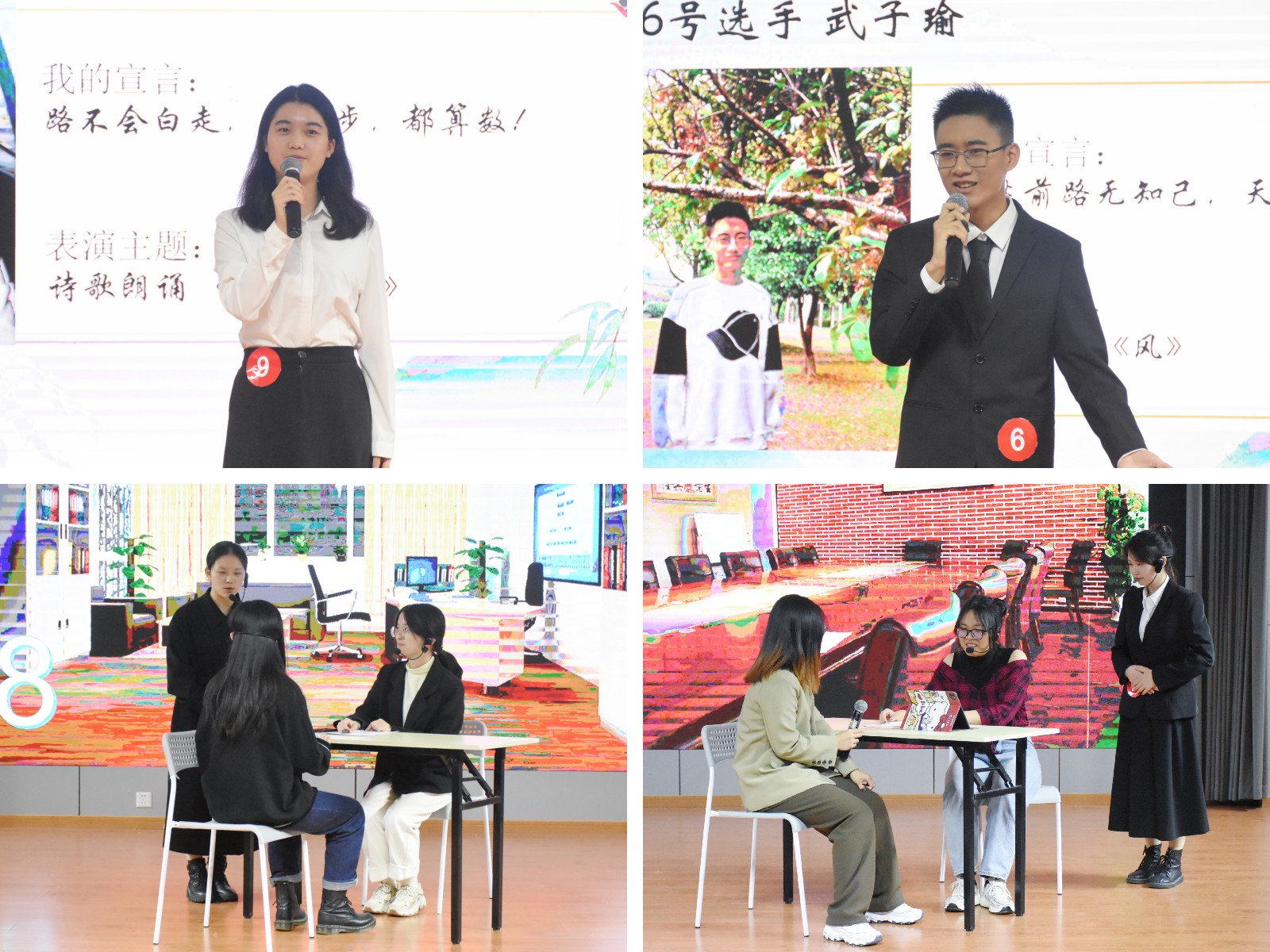 本次大赛分为“秀出自我”“秘书技能”“即兴演讲”三个环节。在“秀出自我”环节中,十位选手在简短的自我介绍后,通过诗歌朗诵、歌曲演唱、舞蹈和魔术等形式展示才艺,同时还宣读了各自的宣言,给在场观众留下了深刻的印象。在“秘书技能”环节中,各位选手模拟职场中可能遇到的突发状况,如前来投诉的顾客、公司合同印错等情况,以此来展现人际沟通、综合应对等能力。在最后一个环节“即兴演讲”中,各位选手根据现场抽取的题目,结合自身的生活经历,引经据典、随机应变,不仅展现出专业的秘书技能和较强的心理素质,他们精彩的演讲也赢得了现场观众热烈的掌声。