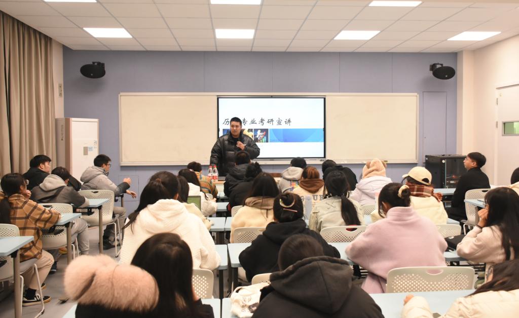 11月30日晚,由人文团学实践就业部承办的第三十六期“学长回来了”活动在1106教室顺利举行。此次活动以线上、线下相结合的形式进行,特邀就读于浙江师范大学世界史专业的谢璟瑶学姐、毕业于天津师范大学世界史专业的沈迪老师为同学们分享考研经验。辅导员赵远哲老师应邀出席,21级、22级历史专业员工到场聆听。