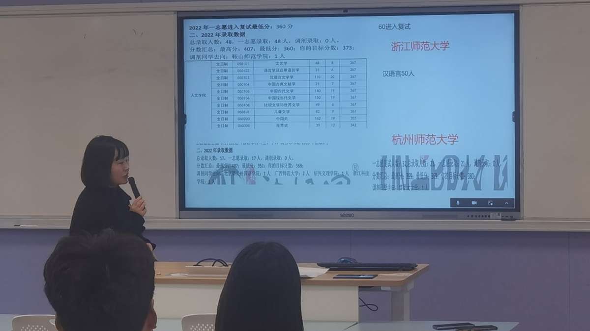 赵晋婷老师从往年考研国家线出发,就今年考研国家线的形势进行了分析。结合同学们考研分数的具体情况,对复试的准备环节进行了规划。赵晋婷老师指出,复试的本质是全方位的自我展示,要针对不同的要求做出相应的准备和创新。针对复试过程中的形式和内容,赵晋婷老师就英语口语、听力测试和综合素质面试等方面的复试技巧进行了说明,建议同学们重视复试考察内容中的专业课面试,拓展自身综合知识。