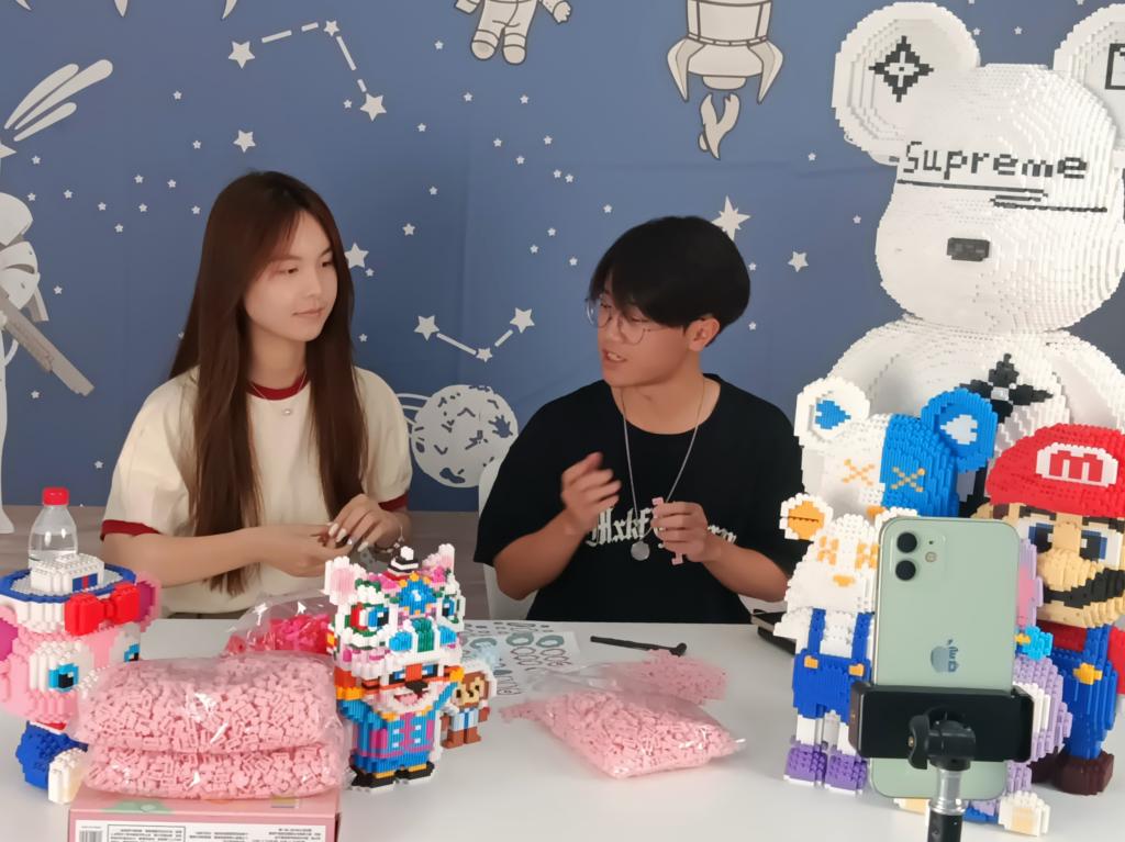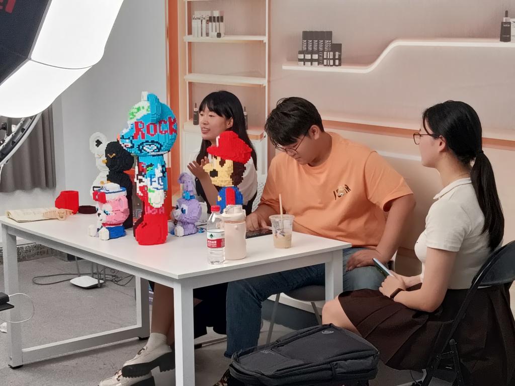直播伊始,各小组主播依照手卡内容,向观众介绍我们的暴力熊系列积木产品,从暴力熊的外包装介绍到暴力熊自身的参数介绍再到暴力熊的售后服务介绍,主播们都竭尽所能地为观众带来更加细致更加全面的讲解。虽然直播间的人数不是很多,但是每个成员都没有因为人数少而懈怠。幸运之神会眷顾努力的人,新号开播,第一小组就达到了三单的成交量。在这个好消息的激励下,实践队成员更加地认真介绍产品。