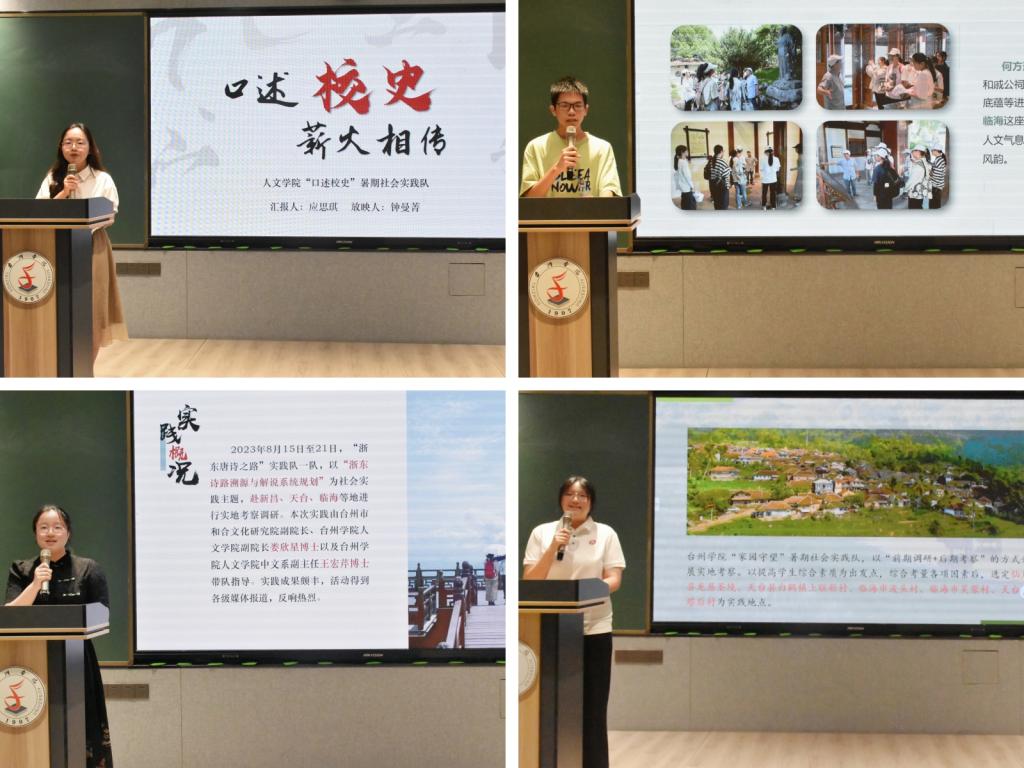 本次评选会分为实践队展示、老师总结两个环节。在展示环节中,9支实践队通过代表讲解与PPT相结合的方式全面展示团队的实践过程、成果与收获。其中,“家园守望”实践队走进古村落,为乡村振兴贡献青年力量;“你好,观澜记者!”实践队通过采访在新闻不同领域深耕的多位记者,提高了自身素养;“春泥萌芽”实践队设置丰富的课程与活动,陪伴孩子们多元化成长;“口述校史”实践队扎根校史沃土,探寻到了档案外的精彩台院故事;“星青年”志愿宣讲团深入社会不同群体,普及传播“两弹一星”精神;“浙东唐诗之路”实践队一队探索景区解说系统的构建,为文旅融合发展探索新范式;“浙东唐诗之路”实践二队,勘踏浙江多地诗路,为诗路文旅融合赋能;“行走的思政大课堂”实践队开展“沉浸式”思政大课堂,将思政课与社会现实紧密结合;“直播电商”实践队聚焦时代新兴营销方式,将所学知识运用于实践之中。