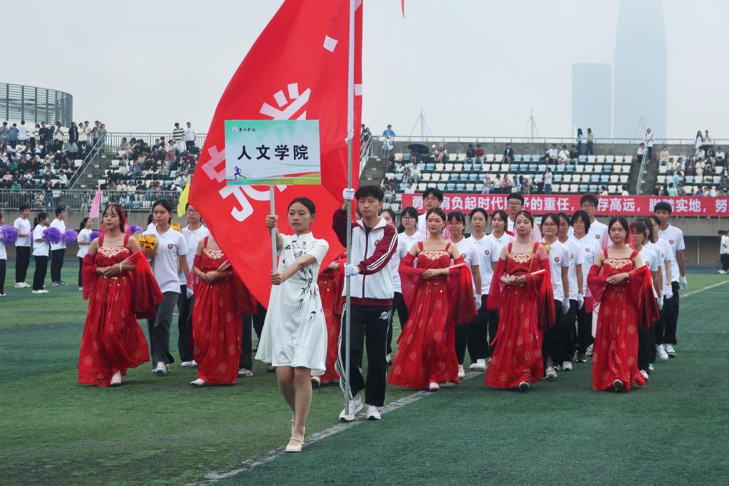 在开幕式上,VSport体育运动方阵首个入场。人文学子穿着精致的汉服,轻摇羽扇,款款而来,用轻灵的脚尖和婀娜的舞姿展现了人文风采和文化底蕴。“修德立人,砺学至文”的院训传达了人文的品格和内涵。浮舟沧海,立马昆仑,是人文学子超越自我、不负众望的期许。