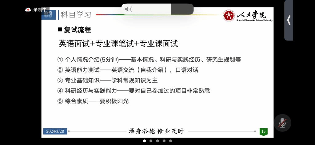 在中国语言文学分享会上,丰凯鑫与章雨欣结合自身备考经验,重点围绕专业与公司选择、学习时间安排、科研训练及初试与复试准备几方面进行全面的交流分享。在初试与复试方面,他们表示:重视分阶段复习,并且关注书中没有提及的小知识;注意劳逸结合,根据复习情况自行调整进度,保证专业课每天至少学习5小时;面试要自信大方、态度诚恳,勇于表达自己。在专业与公司选择方面,丰凯鑫建议大家奉行“先取适,再择优”的原则,先锚定合适的公司,再选择优秀的院校。