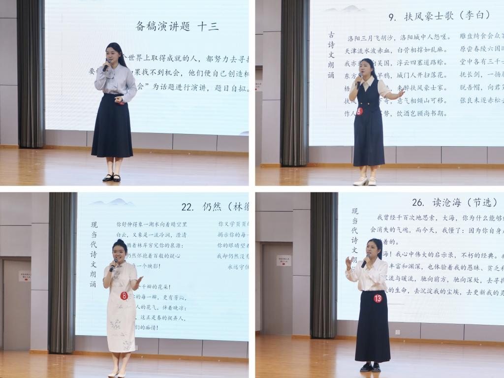第二个环节,选手们针对自选主题进行备稿演讲。江帆平易近人的言辞打动了评委老师,黄源源直击现实的言语体现出演讲的现实性意义,陈子莹借题谈出了自己和身边人的心声,表达出了困惑和内心的纠结。