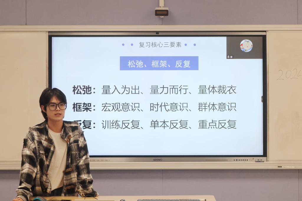 随后,邬佳乐也根据自身考研经历,强调备考过程中需效率至上,高效学习,并且指出复习核心三要素是松弛、框架、反复。此外,他向同学们提出了择校和择专业方面的建议,指出考研需量力而行,选择合适的目标并努力奋斗,切忌好高骛远。最后他向大家分享了他备考时的一些方法与答题时的技巧,并推荐了一些优秀的学习资源平台供大家参考。