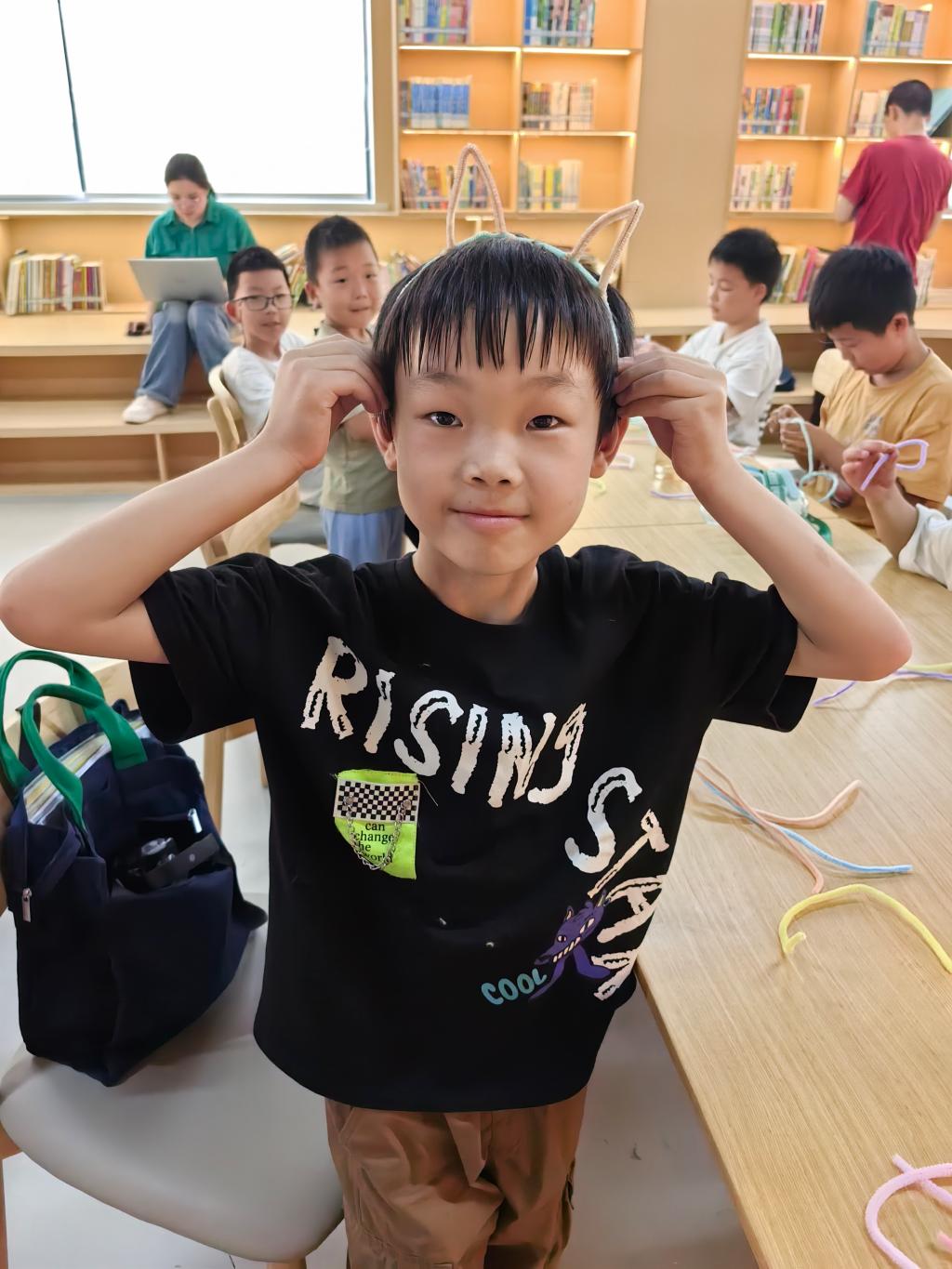 午后时光,实践队又为小朋友们带来了“扭扭棒趣味手工”课。在队员们的引导下,小朋友们用灵巧的双手将一根根普通的扭扭棒编织成精美的中国结,借此传达对祖国的深情厚谊。此外,小朋友们还充分发挥想象力,创造出各式各样的新作品,如搞怪的眼镜、绚丽的小花、可爱的发箍等,每一件作品都凝聚着孩子们的创意与汗水,也展现了他们对生活的热爱。