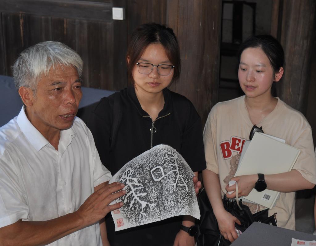 中午时分,实践队来到承先书院。参观期间,仙居民间文史研究员郑昌来向大家讲述村史,带领大家深入参观书院,感知背后文化。书院内文化主要有岩画文化、御史文化和教育文化。书院内的岩画拓印件基本都是由郑昌来从山上拓印下来的,他向实践队员们详细介绍了岩画背后的天文学知识、图腾崇拜和时空规划等内涵。书院教育文化方面,郑昌来讲述了当地教育文化发展的历史。实践队员们受益匪浅。