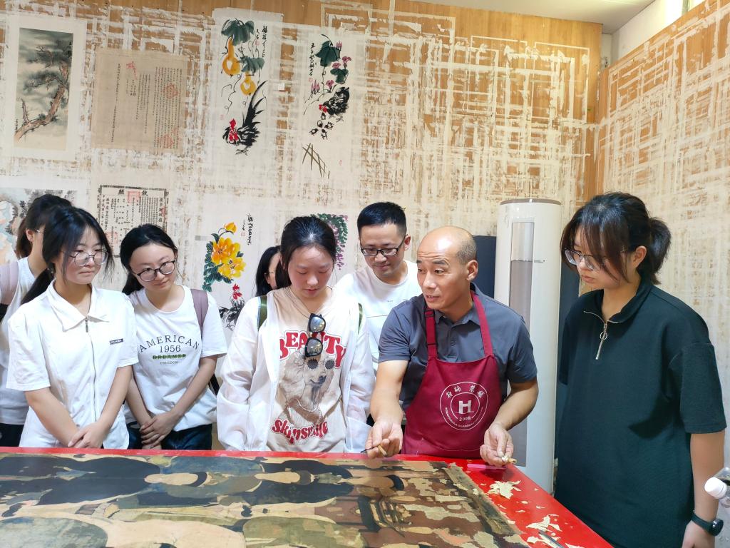 7月7日上午,实践队抵达田市镇。田聚物华,市汇天宝。田市镇,又名“云田古镇”,有云田之上集市的美誉,早在明代就已立市,曾是仙居历史上最重要的古集市之一。队员们首先来到云田古街街区,街区内建筑古朴,民居还留有上世纪的标语口号,历史气息浓厚。不多时,队员们陆续游览了九思回廊、思源井和吴芾纪念堂,并深入柏楠书画装裱研究院,倾听经理吴建江为大家介绍书画修复与装裱的工艺流程。在吴经理的躬身示范下,队员们了解了机器修复与传统手工修复的区别,理解了这项非遗手工的重要性。
