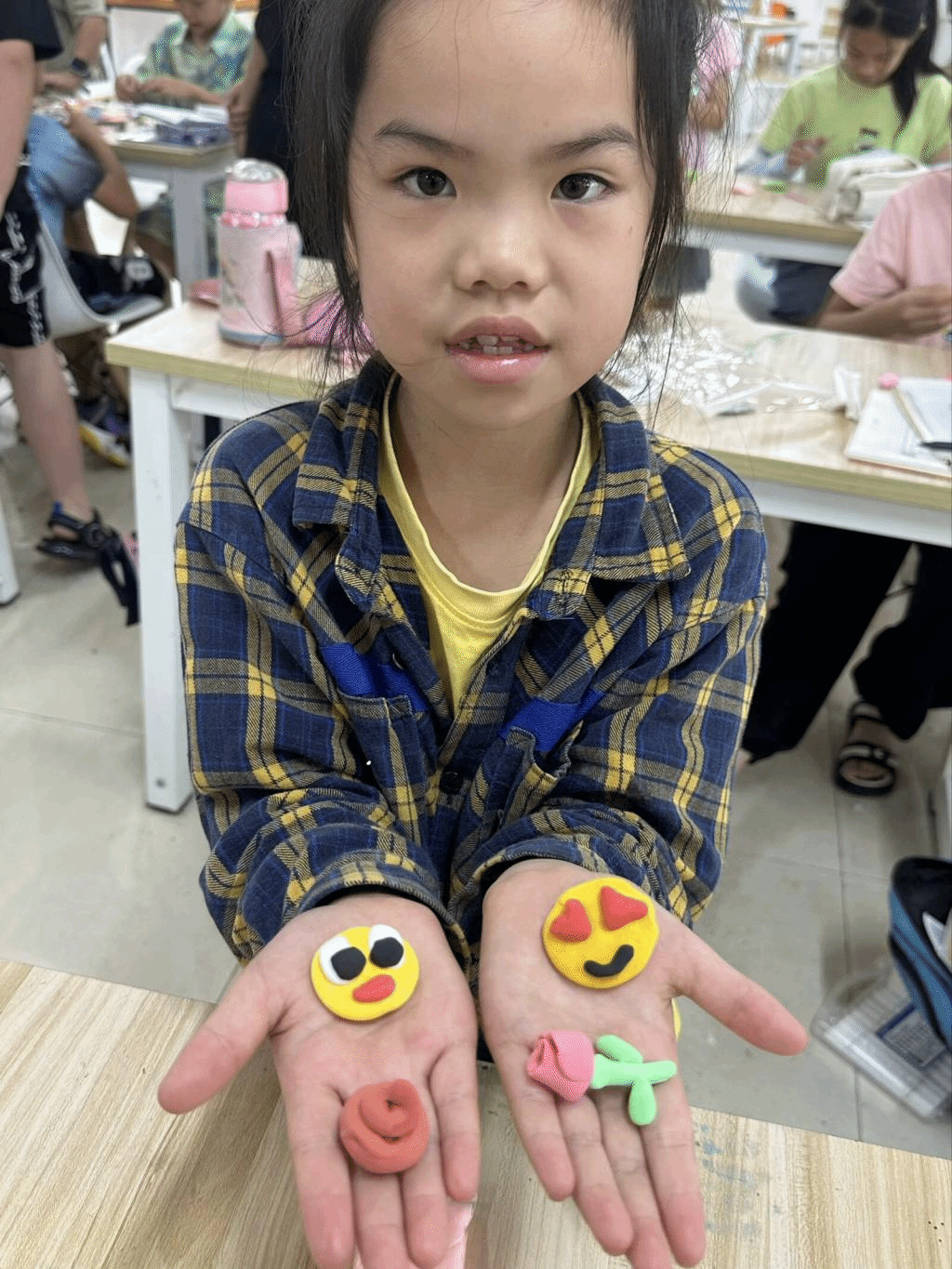 在接下来的时间,通过实践队员们的耐心引导,孩子们尝试用粘土来制作各式各样的表情包。一揉一搓,一捏一扭,孩子们巧妙地将粘土与“喜怒哀乐”表情包融合在一起,用双手捏出自己脑子的奇思妙想,生动又有趣。粘土表情包的制作旨在丰富孩子们的想象力和创造力,增强他们的动手能力和创新能力。