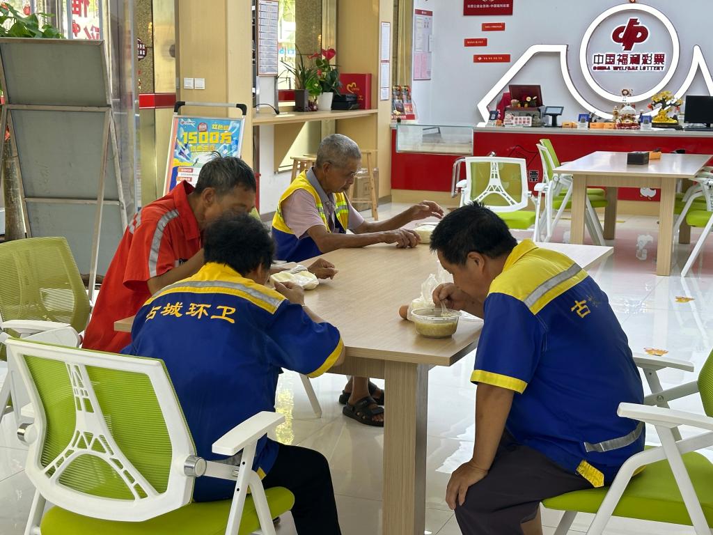 环卫工人在助联体内用餐