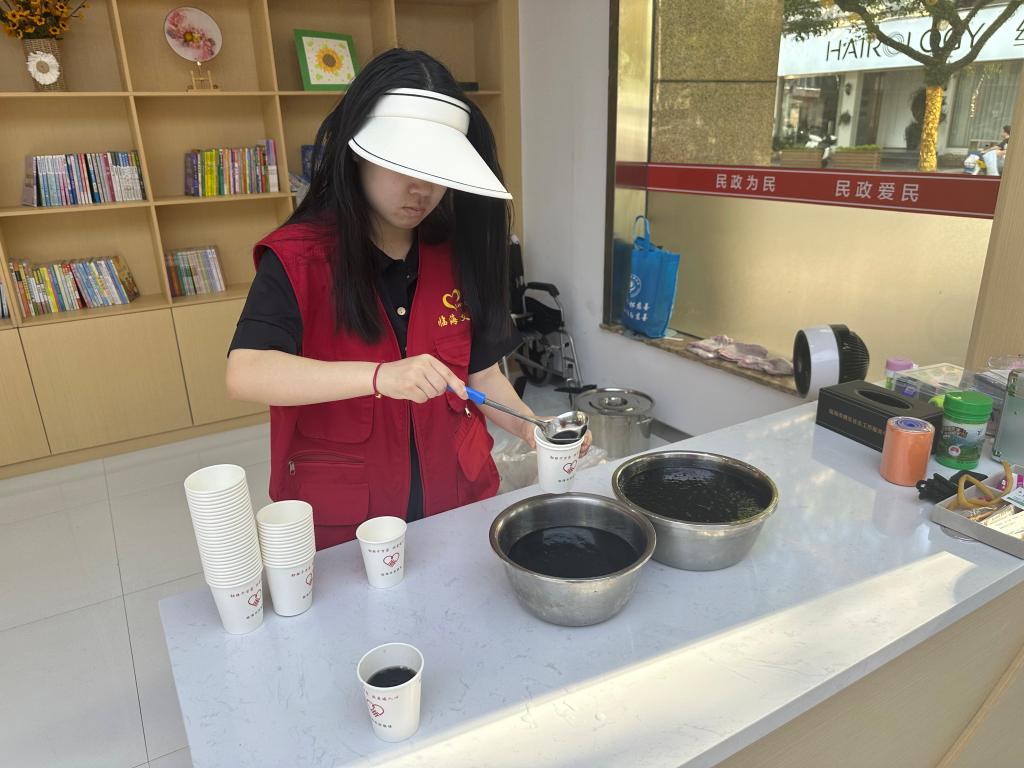除了每周四固定的爱心早餐活动,助联体还准备了草糊和绿豆汤等清凉解暑的饮品供往来行人享用。助联体每日的长期开放不仅方便了附近作业的环卫工人,也为周边的居民们提供了夏日休闲的空间。