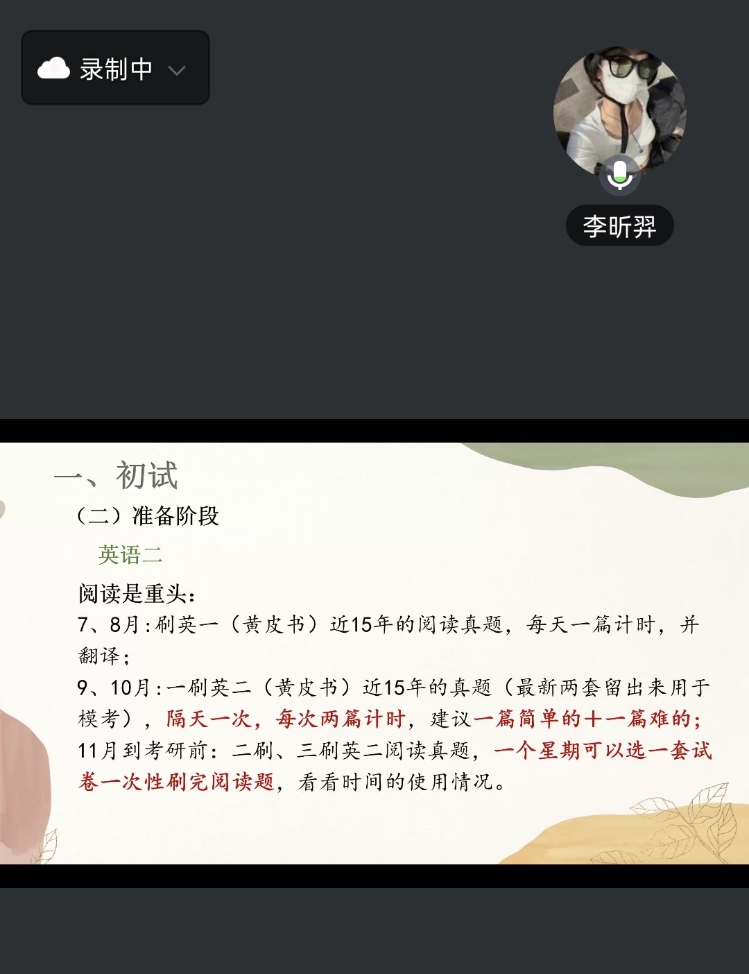 接着,李昕羿指出,在准备材料阶段,考生需要了解目标院校的导师、研究方向和发表的论文。关于复试的准备阶段,她提醒大家着重关注目标院校官网,提供所需的个人材料。此外,她还建议考生日常要增强时间管理意识,加强中英文口语练习,以更好地应对复试中的面试环节。针对面试环节,她建议考生穿着得体大方,举止礼貌自信,充分展现自己的优点,以积极的态度面对面试中的各种难题。