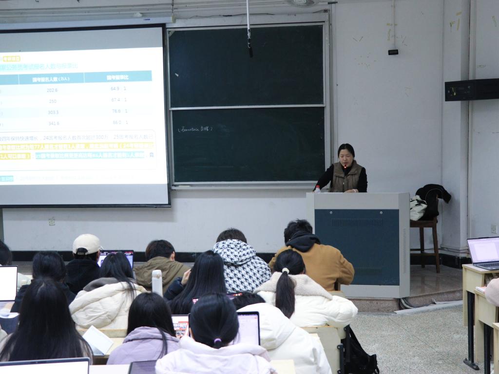 讲座伊始,袁利丹从国家政策和企业招聘方面对当前考研的宏观环境进行了详细解读。同时,她结合自身经历,讲述了同年龄段时的迷茫与奋进,阐述了考研对职业发展的深远影响,让同学们真切认识到考研不仅是提升学历的途径,更是为未来职业发展筑牢根基。随后,她通过列举各大高校汉语言师范专业的招生数据,让同学们对考研的竞争态势有了直观的认识。