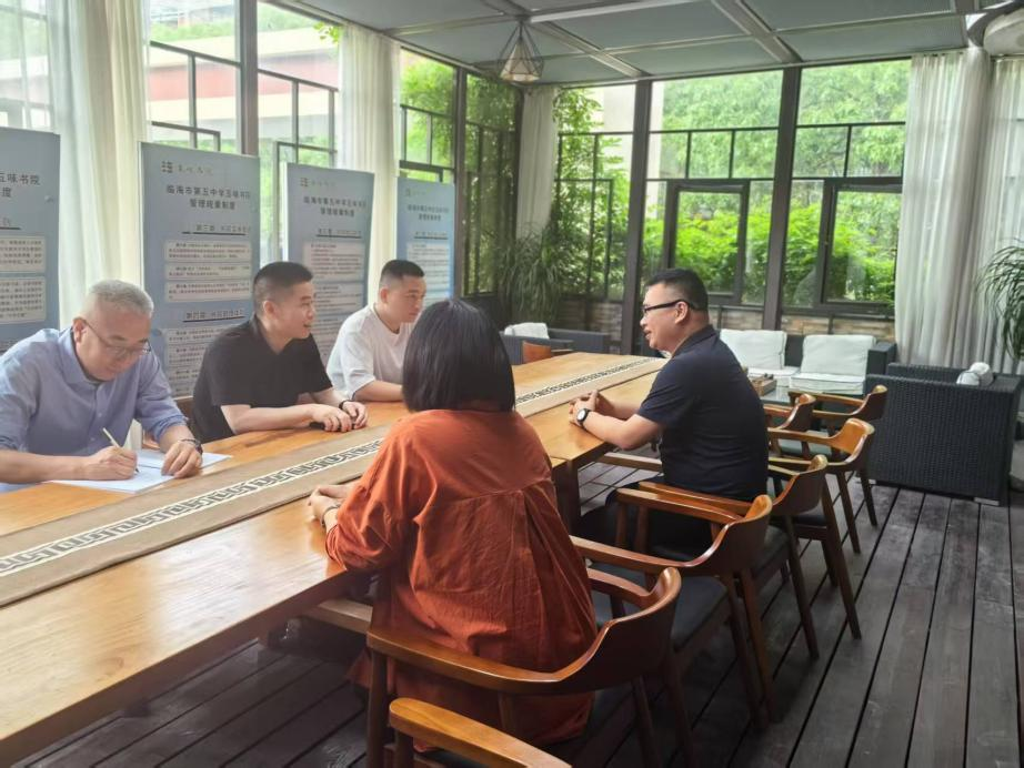 员工座谈会后,陈灵强书记、康海荣老师、张呈忠老师与临海市第五中学董事长陈贞贞、副董事长李俊于会议室展开了一场会谈。会谈以全面总结实习工作、推动校际合作迈向新台阶为核心,围绕实习实践成果、教学经验共享、人才联合培养等多个维度展开交流。