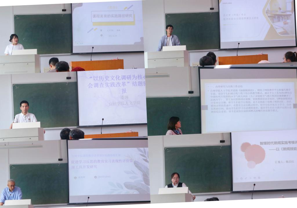 本次验收采用“校外评审+校内汇报”模式。校外专家提前评审项目材料,校内汇报中每位负责人用8分钟结合多元形式展示改革实践。汇报环节亮点频现:陈楠老师团队针对美学课程抽象化的特点,创新“循环课堂+整合式教学”模式,通过线上预习、线下实践讨论的闭环,将理论与生活审美结合,课程入选中国高等教育学会优秀案例,并推动教材编写;康海荣老师主持的“教育实习评价量规工具开发”项目,邀请员工参与设计,开发2.0版工具,聚焦教学技能细分模块,获得评审组“师范教育评价突破”的肯定;还有老师团队深耕乡村振兴调研,打造“调研—竞赛”教学体系,相关项目获浙江省老员工科技作品竞赛银奖等多项荣誉,实践育人成效显著。