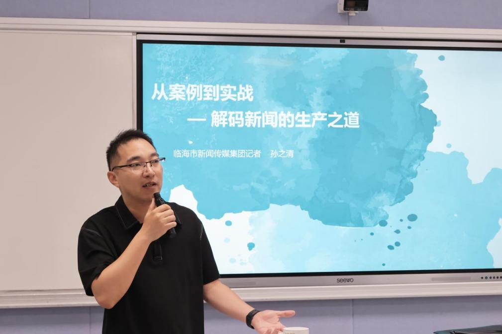 一方面,孙之清结合9月1日至6日的新闻案例,详细拆解新闻生产流程,深入讲解报题审批、新闻播出及采制细节。以9月1日全市中小学开学报道为例,介绍单位派六路记者采访、选刚入学小员工契合主题、用空镜头解决儿童表达问题、多角度拍摄提升新闻完整性与感染力的做法;针对专业性报道,提出以小切口切入深挖价值;以新任临海市市委书记调研报道为例,说明时政新闻需精准捕捉核心信息。同时还分析了其他类型新闻稿件,让同学们受益良多。