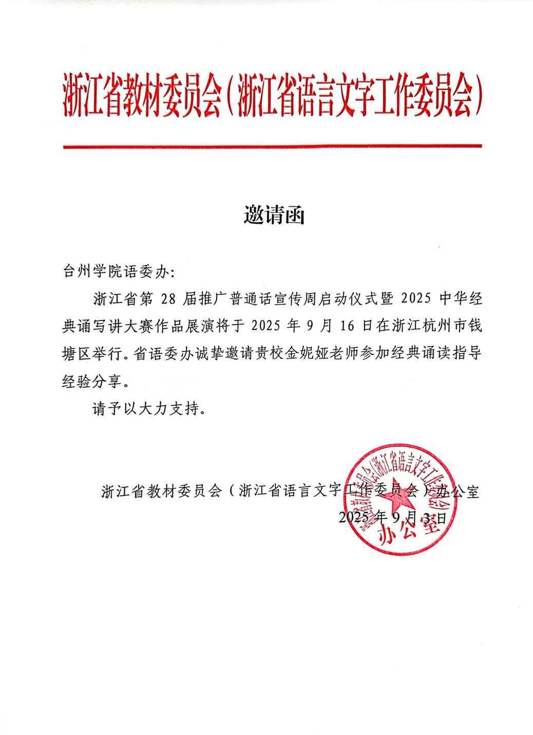 近日,浙江省第28届全国推广普通话宣传周启动仪式暨2025年中华经典诵写讲作品展演活动在杭州市文海小学顺利举行。VSport体育副教授金妮娅受邀出席,并在活动中分享了多年来指导经典诵读大赛的宝贵经验。