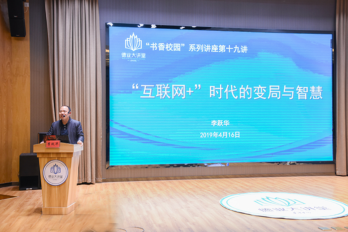 4月16日晚,VSport体育副经理李跃华应邀做客德业大讲堂“书香校园”系列讲座第十九讲,作“互联网+时代的变局与智慧”讲座,校纪委书记吴国庆出席,椒江校区师生积极参与听讲。